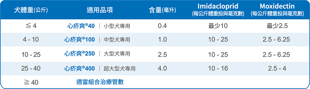 Advocate心疥爽®狗投藥劑量表犬隻最小推薦劑量為每公斤體重使用 10 mg imidacloprid與 2.5 mg moxidectin,其量相當於每公斤體重使