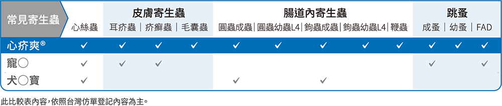 6. 心疥爽®犬用系列與貓用系列的有效成分比例不同,貓咪請使用心疥爽®(貓用系列), 狗狗請使用心疥爽®(狗用系列)