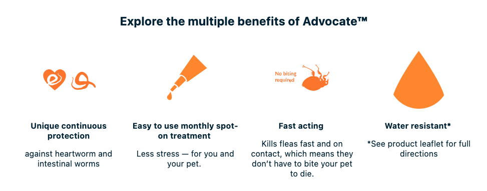 Following the first application, Advocate spreads across the dog’s skin and coat within one day, killing existing fleas. Advocate stops reinfesting fleas from biting within 3 to 5 minutes and kills within 1 hour1. Advocate also kills flea larvae in your dog’s environment.