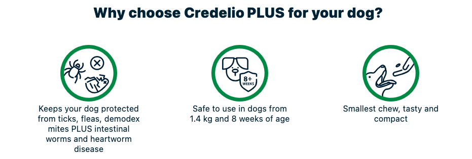 Before changing to Credelio PLUS, check that your dog is older than 8 weeks of age, and weighs at least 1.4 kg. If changing from a product that provides tick control, maintain the dosing interval of the original product - i.e. start Credelio PLUS when your dog is next due for their tick prevention treatment, then continue monthly dosing. However, if changing from a product that does not control ticks, it is important to start protecting your dog as soon as possible. Give Credelio PLUS with your dog’s next meal. However, if you’ve given your dog a worming product today, wait a couple of days before administering Credelio PLUS.