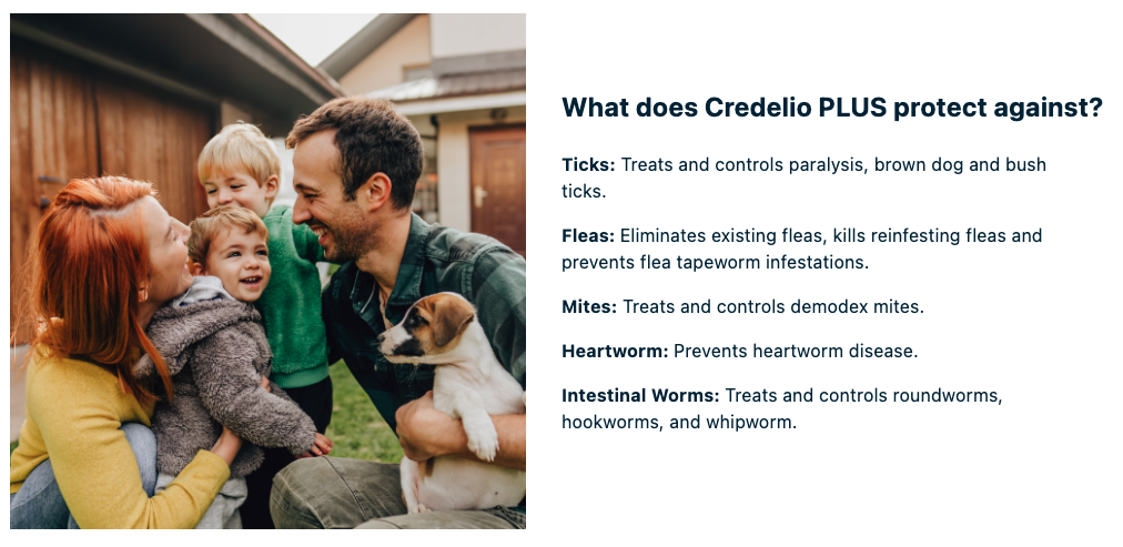 在更換為 Credelio PLUS 之前,請確保您的狗狗年齡超過 8 週,體重至少 1.4 公斤。如果您之前使用過蜱蟲控制產品,請保持原始產品的給藥間隔——例如,在您的狗下次進行蜱蟲預防治療時開始使用 Credelio PLUS,然後繼續每月給藥。但是,如果您之前使用過非蜱蟲控制產品,請務必盡快開始保護您的狗。請在愛犬下次用餐時服用 Credelio PLUS。但是,如果您今天已經給愛犬服用了驅蟲產品,請等待幾天再服用 Credelio PLUS。