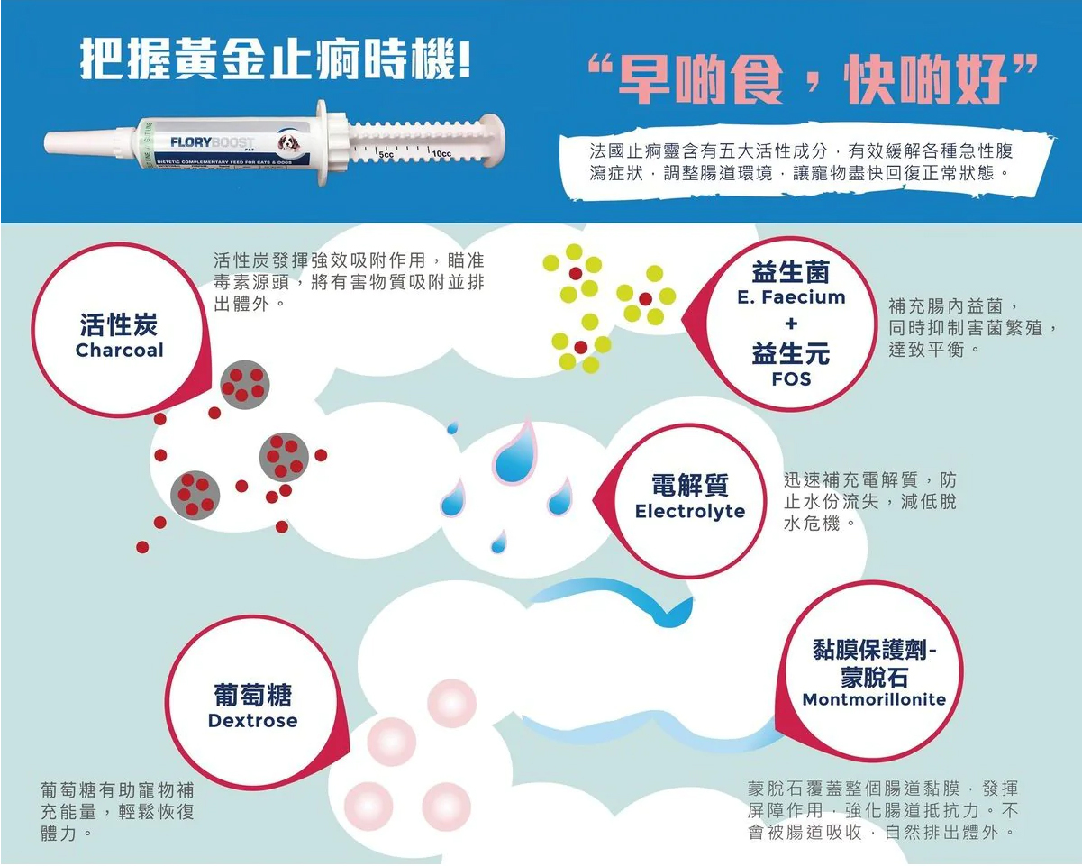 Floryboost®法國止痾靈配方採用活性炭和蒙脫石,發揮吸附和屏障作用,將有害物質排出體外。緩解寵物各種急性肚瀉症狀。配方更有電解質和葡萄糖,減低脫水危機和恢復體力。天然成分,迅速調整腸道環境。