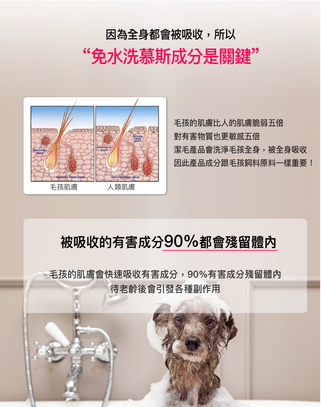100%天然低敏洗淨成分溫和帶走毛髮或肉墊髒污,添加豐富扁柏水可補足寵物毛髮所需水分,維持水潤光澤