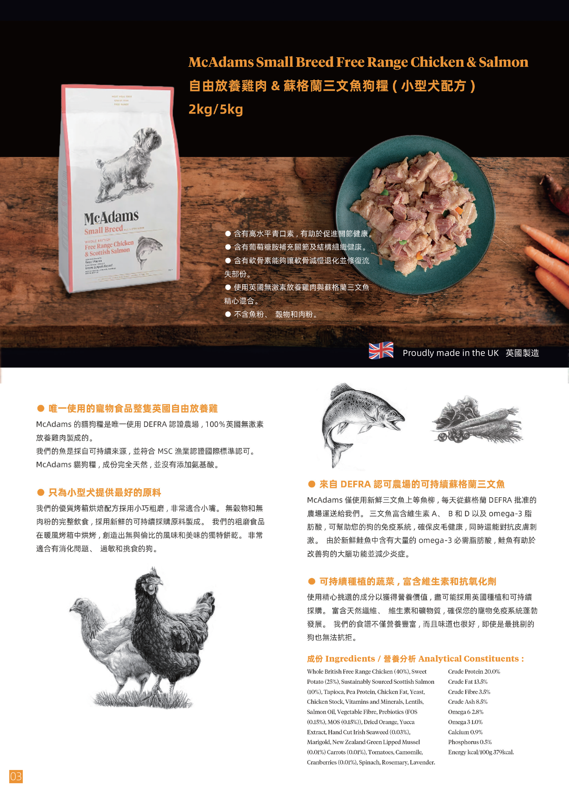 McAdams 僅使用優質的新鮮鮭魚片,每天從蘇格蘭 DEFRA 批准的農場運送到我們這裡。鮭魚富含維生素 A、B 和 D 以及 omega-3 脂肪酸,有助於增強狗狗的免疫系統,確保皮毛健康,同時也能對抗皮膚刺激。