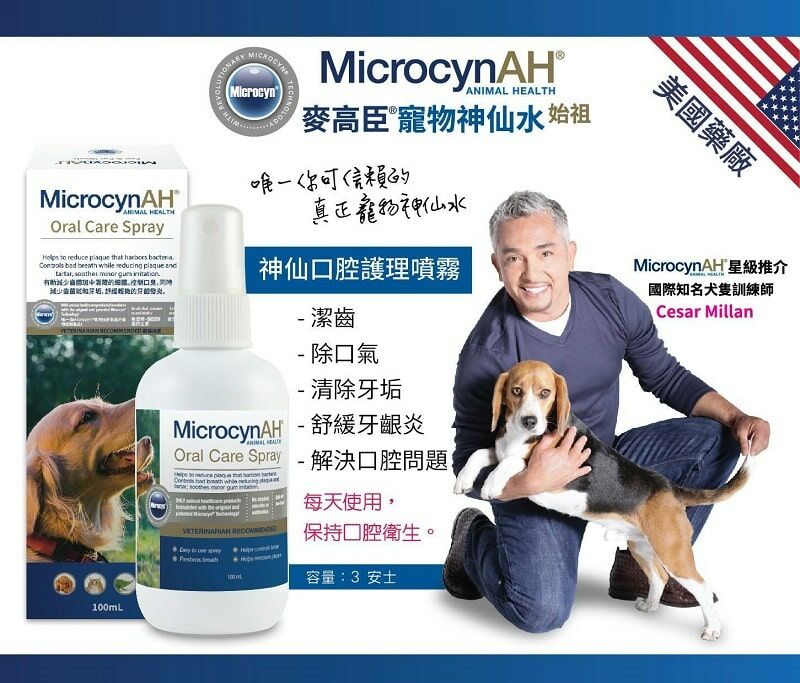 MicrocynAH® 麥高臣寵物口腔護理噴霧,有效減少牙石和牙垢,除口臭,同時減少口腔內的細菌,舒緩輕微的牙齦發炎。