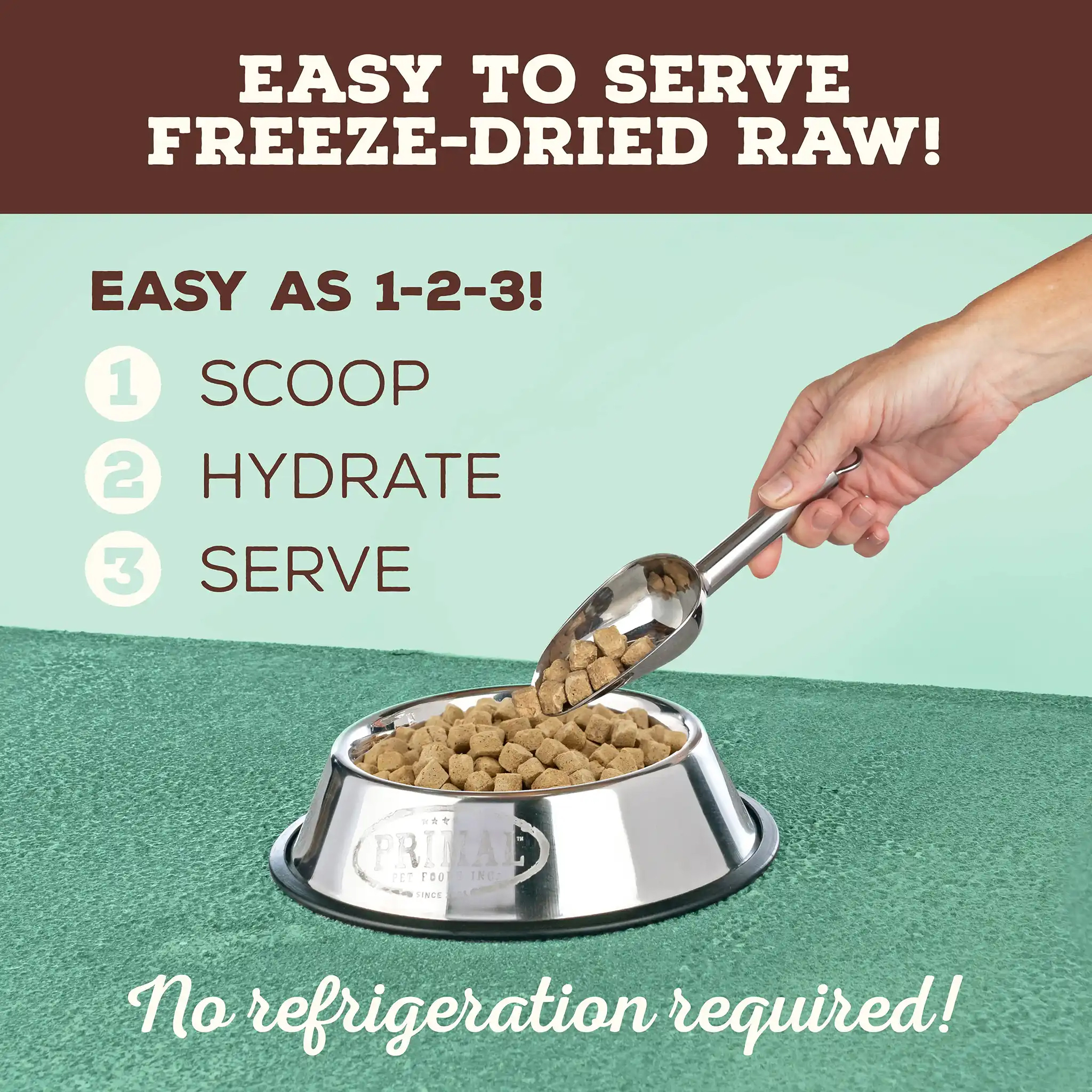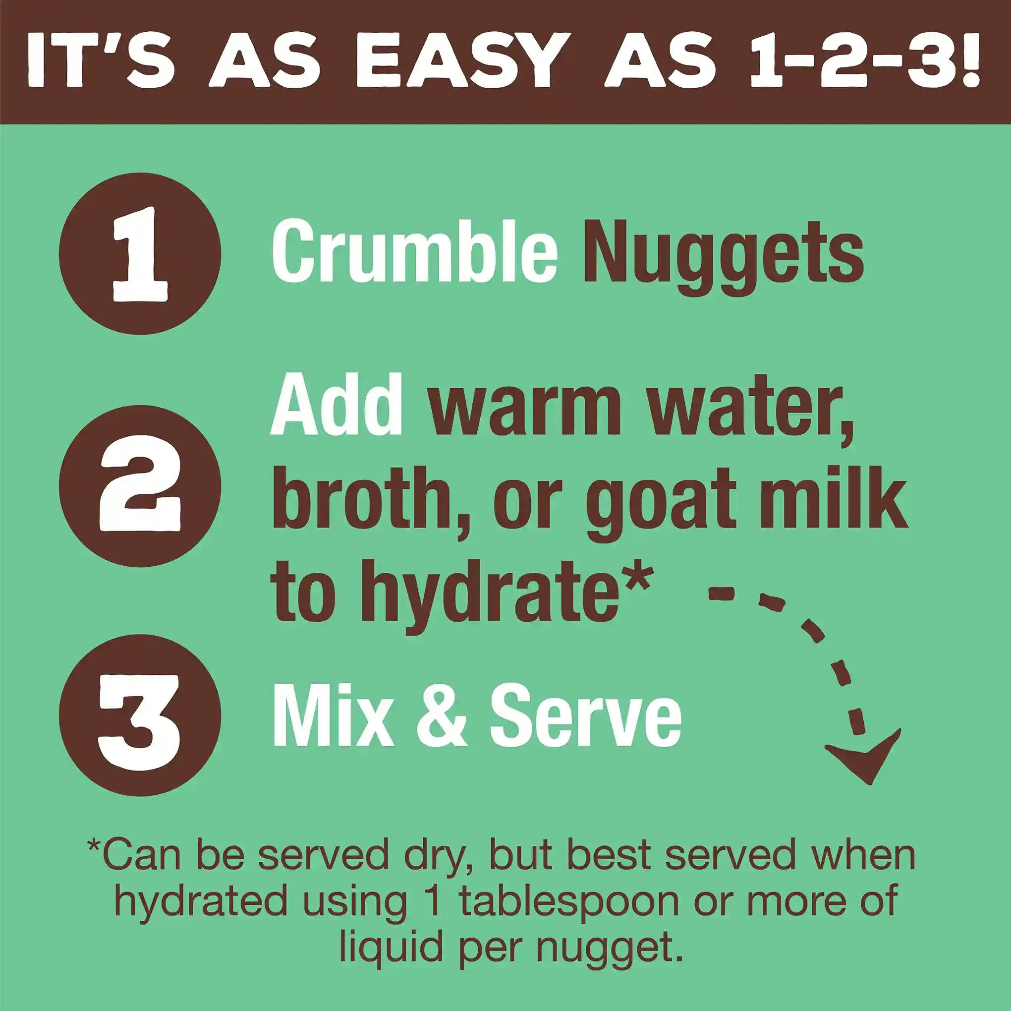 必須加 水(室溫水)/骨湯/動物用奶 餵食,每一杯脫水生肉粒粒加一1/3 杯水(室溫水)/骨湯/動物用奶。