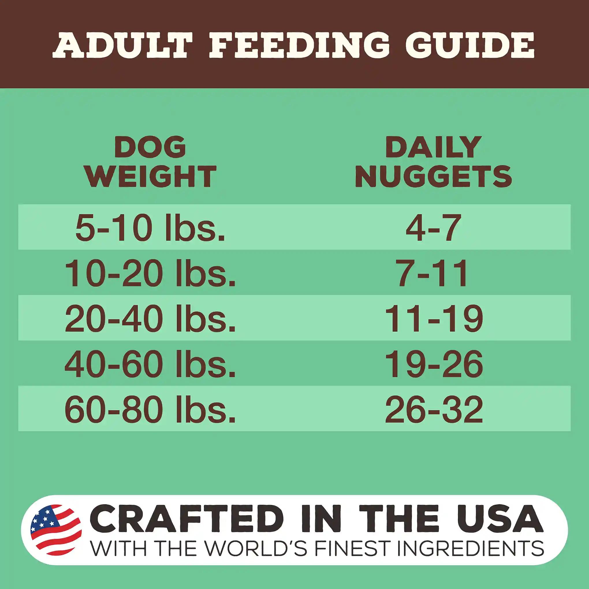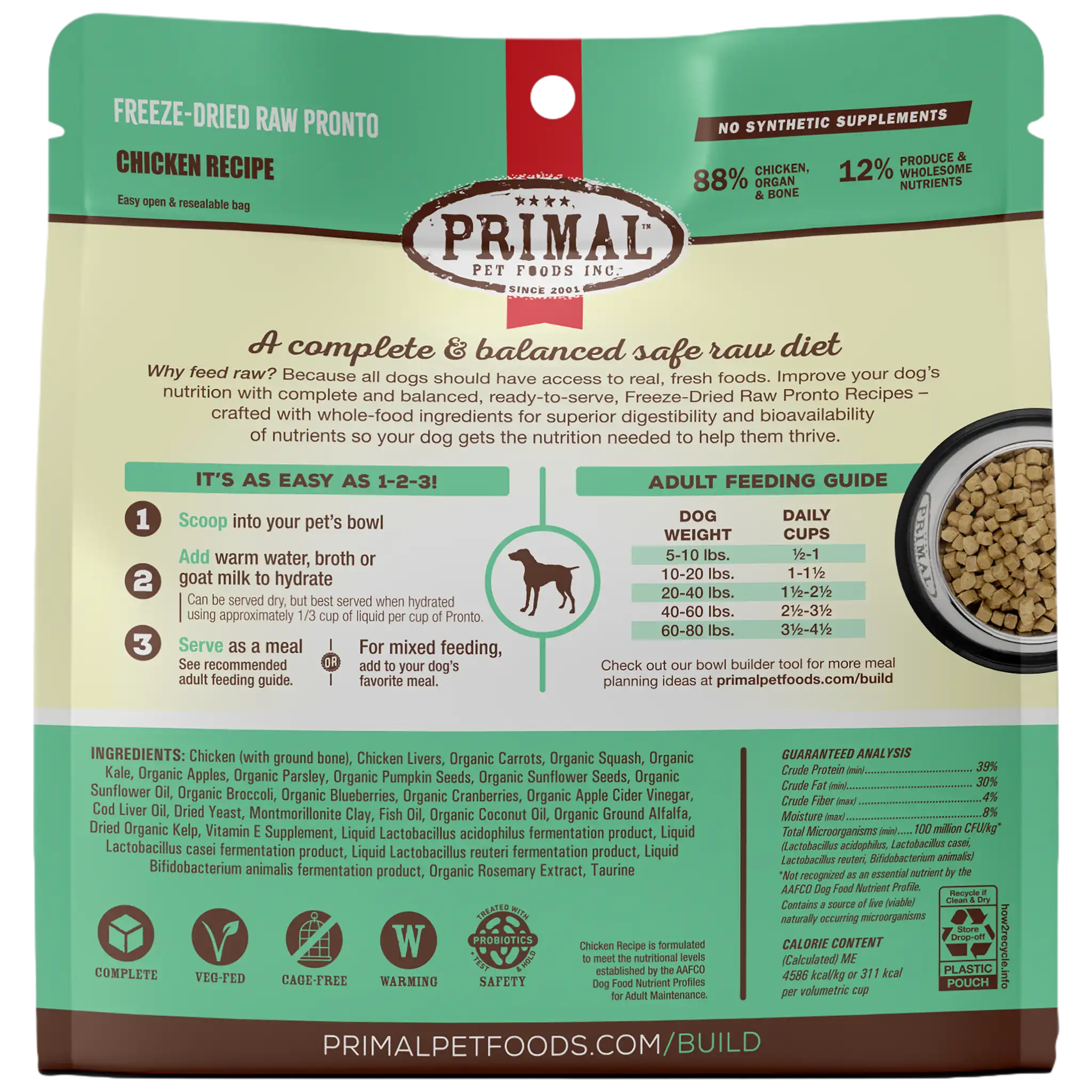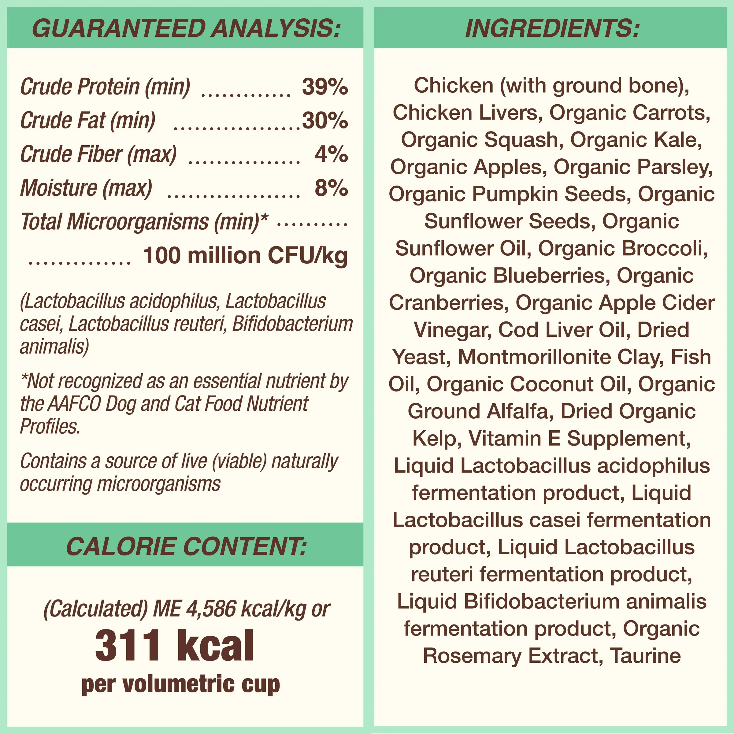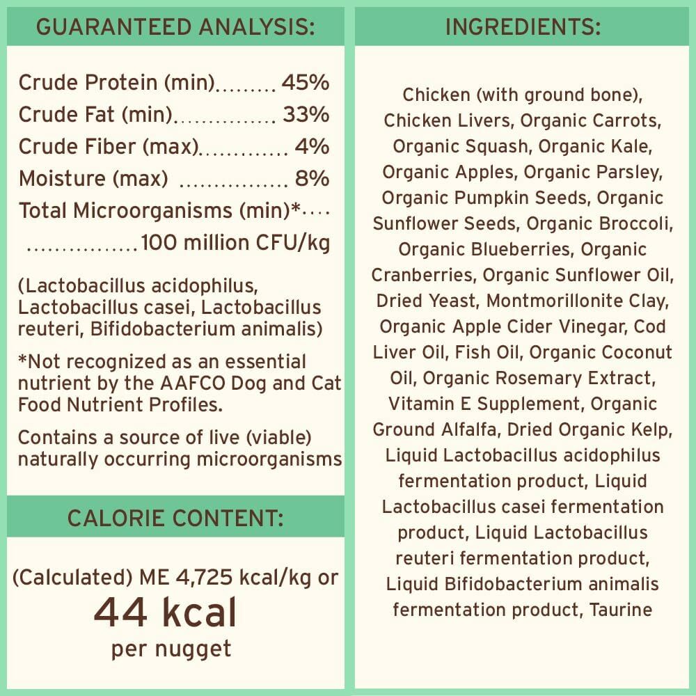 雞肉(帶碎骨)、雞肝、有機胡蘿蔔、有機南瓜、有機羽衣甘藍、有機蘋果、有機歐芹、有機南瓜子、有機葵花籽、有機葵花籽油、有機西蘭花、有機藍莓、有機蔓越莓、有機蘋果醋, 鱈魚肝、幹酵母、蒙脫土、魚油、有機椰子油、有機紫花苜蓿粉、幹有機海帶、維生素E補充劑、液體嗜酸乳桿菌發酵產物、液體乳酸桿菌發酵產物、液體羅伊氏乳桿菌發酵產物、液體雙歧桿菌動物發酵產物、有機迷迭香提取物、牛磺酸