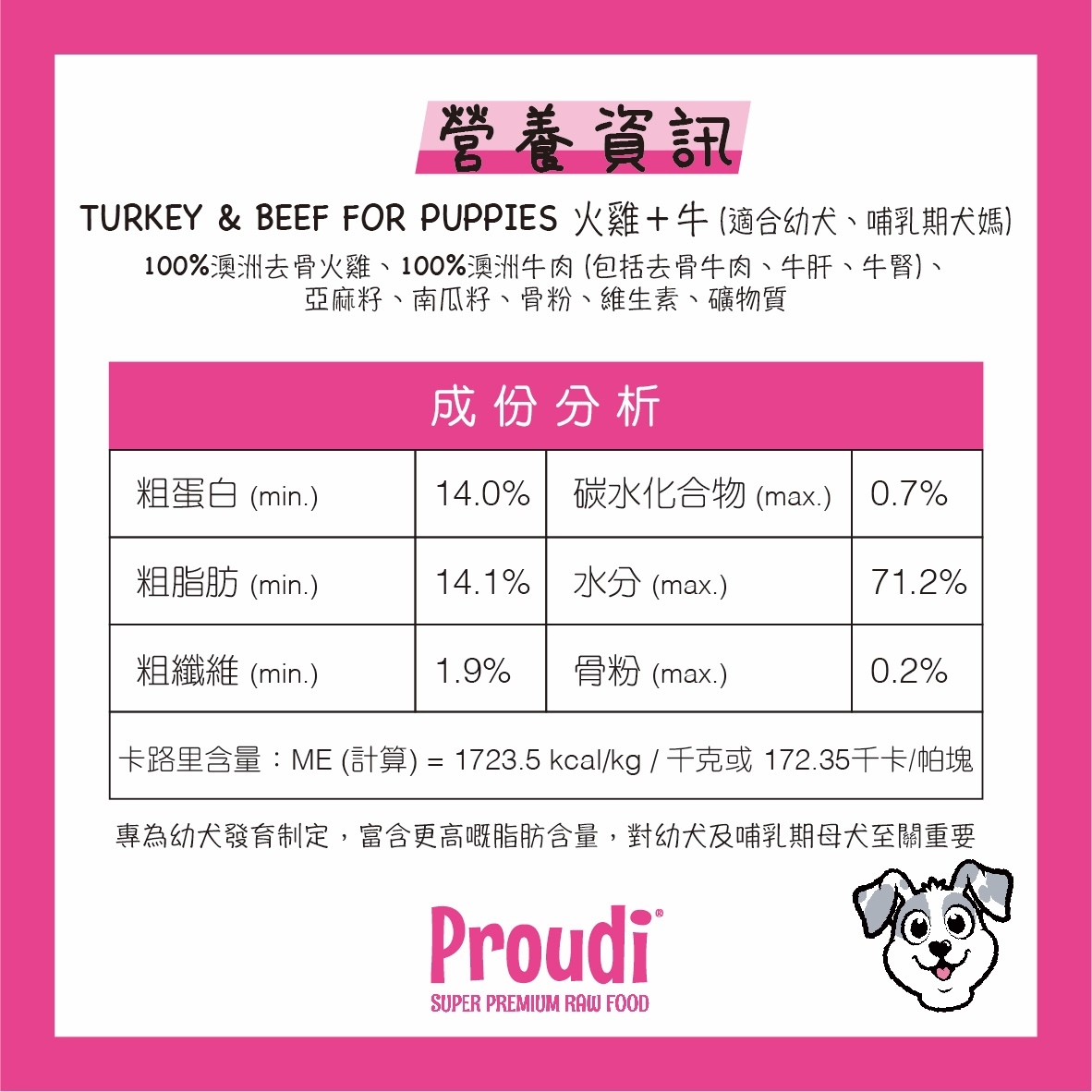 Proudi® 狗用生肉餅符合並超越 AAFCO 和 FEDIAF 為幼犬和成年狗所要求的所有營養水平。