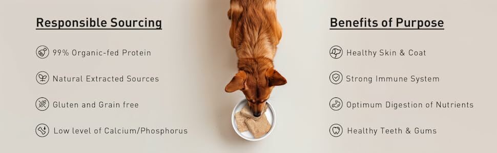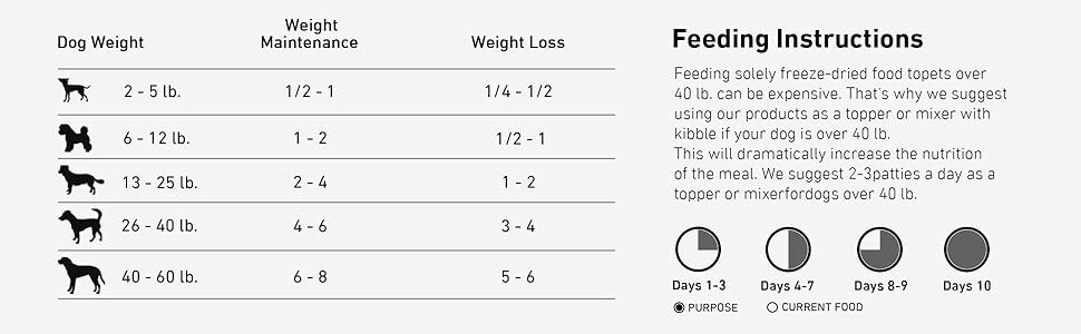 40磅以上的寵物餵食凍乾食物可能會很昂貴。我們建議使用我們的產品作為topper添加味道或mixer配合各種自製餐單。這將大大增加膳食的營養。我們建議每天2-3塊作為超過40磅的狗的topper或mixer。