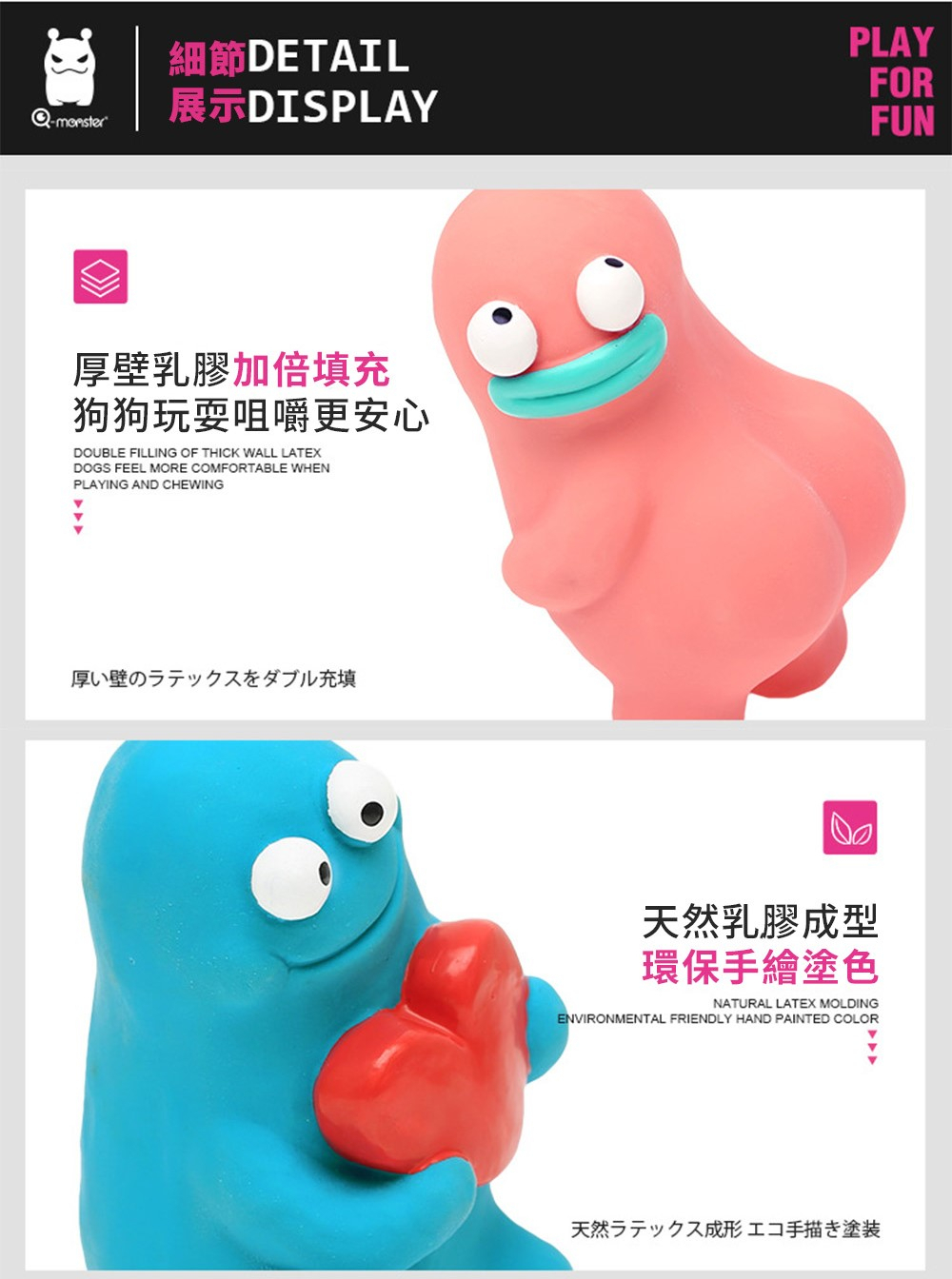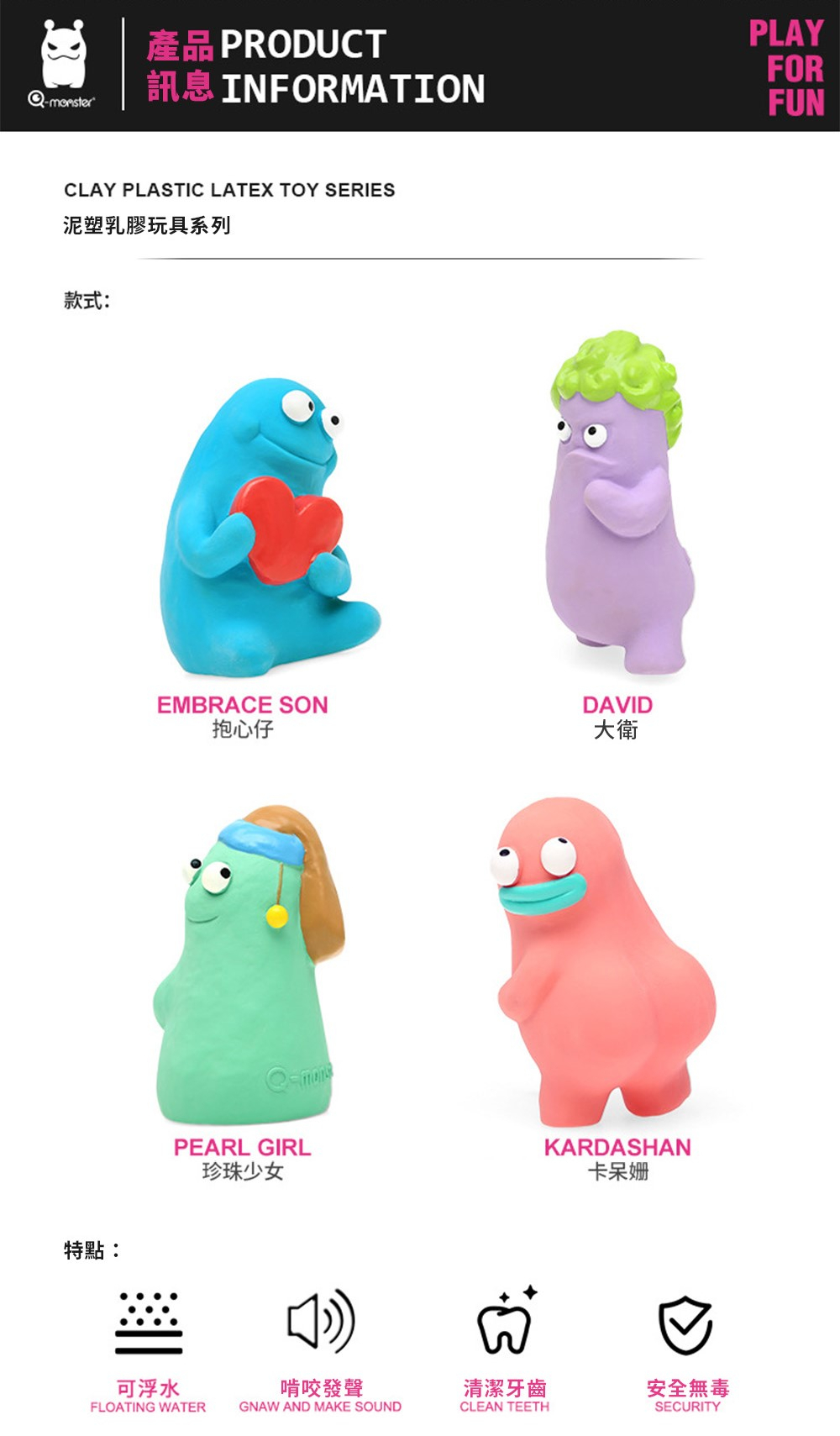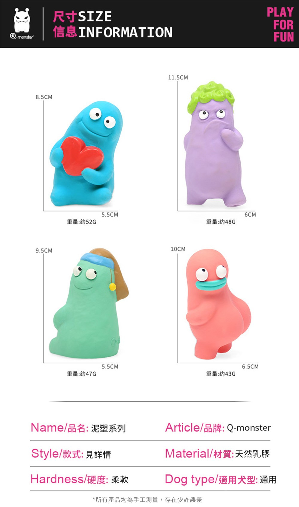 你知道我最近發現了一個超Q的小寶藏嗎?Q-monster 推出的這款《泥塑乳膠發聲玩具》,真的是一秒讓我家的狗狗瘋狂愛上。它的外型像極了某些動畫角色,而且每一隻都有自己的特色和名字,什麼「抱心仔」「大衛」「珍珠少女」「卡呆姍」…連我自己都差點蒐集起來了🤣
