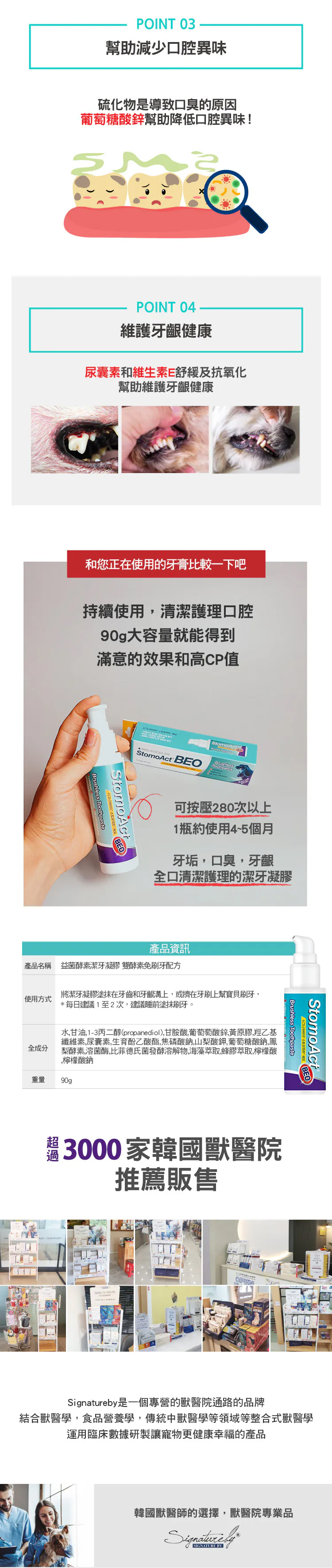 雙酵素益菌潔凝膠,針對貓狗口腔常見多種困擾的潔牙好對策,用塗抹也有很好的潔牙效果。溶菌酶和鳳梨酵素雙酵素幫助對付牙菌斑和牙結石困擾,葡萄糖酸鋅減少食物引起口臭,維生素E和尿囊素維持牙齦健康;添加比菲德氏菌衍生物,刷牙後,幫助營造口腔健康益菌環境。搭配牙刷固定刷牙,效果更佳。