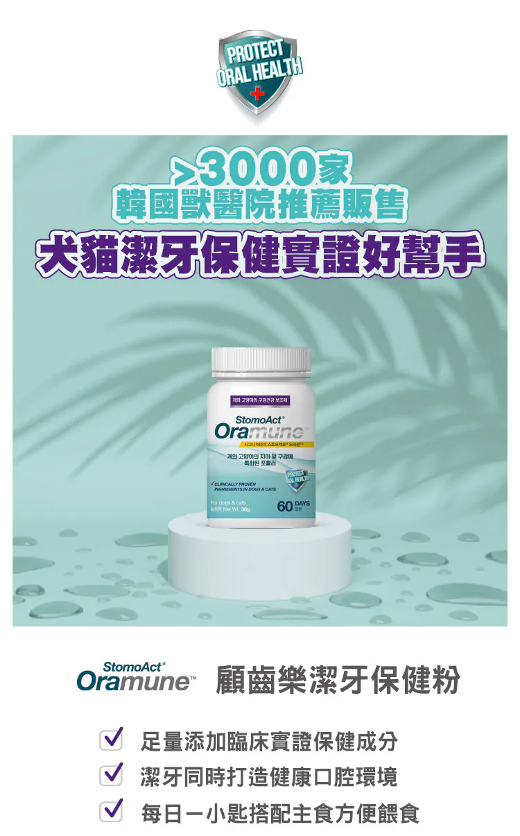 貓咪狗狗有牙結石,牙齦健康困擾,無法好好刷牙?咀嚼錠含臨床實證保健成分IgY-GP免疫抗體,可針對引起牙齦牙周問題的酵素-Gingipain作用,用吃的幫助維持牙齦健康,支持口腔免疫力。足量添加犬貓臨床實證的口腔保健成分,專利配方,每日搭配主食餵食,可以幫助潔牙,同時維護口腔健康。
