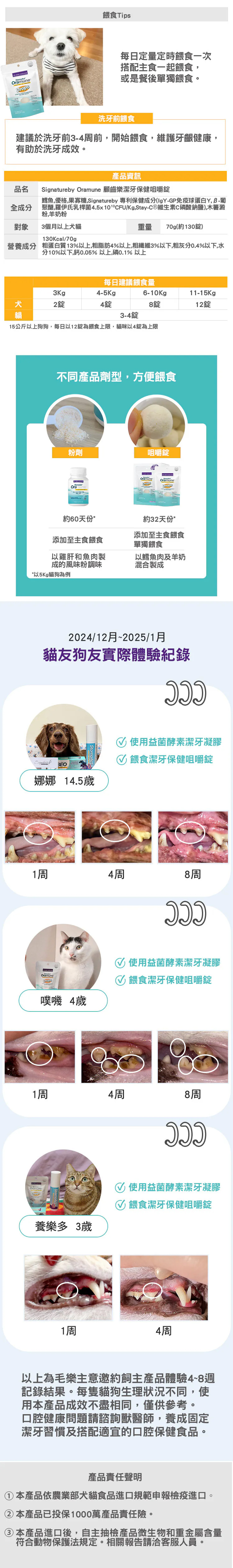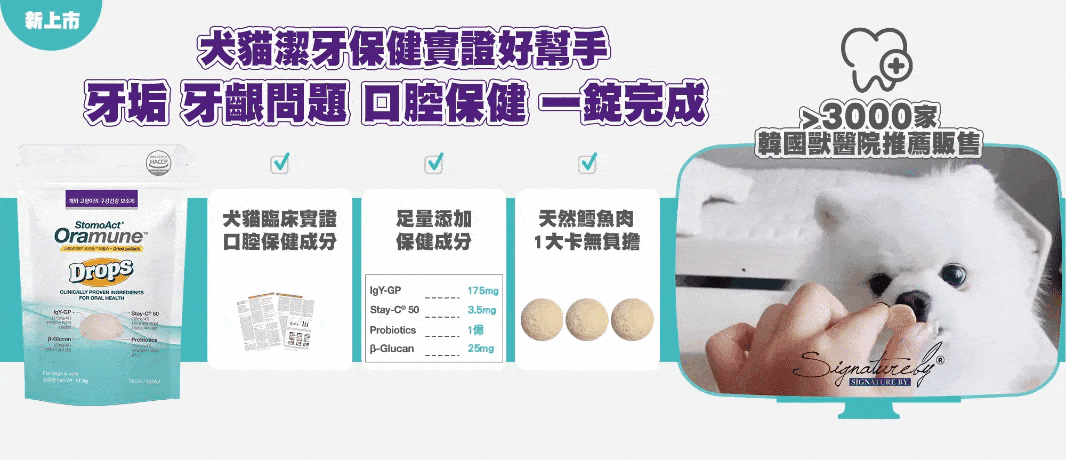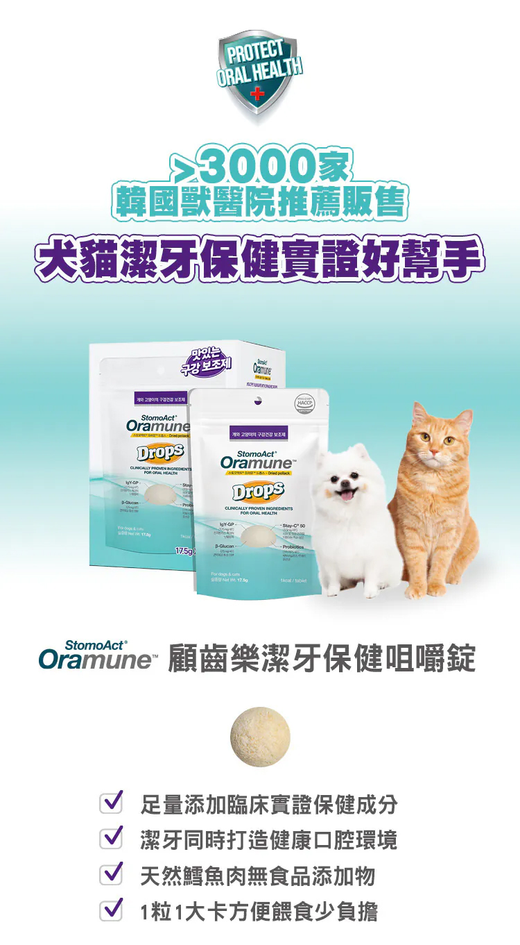 貓咪狗狗有牙結石,牙齦健康困擾,無法好好刷牙?咀嚼錠含臨床實證保健成分IgY-GP免疫抗體,可針對引起牙齦牙周問題的酵素-Gingipain作用,用吃的幫助維持牙齦健康,支持口腔免疫力。添加鱈魚肉及羊奶,如小零食般的脆脆口感,適口性佳,足量添加犬貓臨床實證的口腔保健成分,專利配方,可以幫助潔牙,同時維護口腔健康。