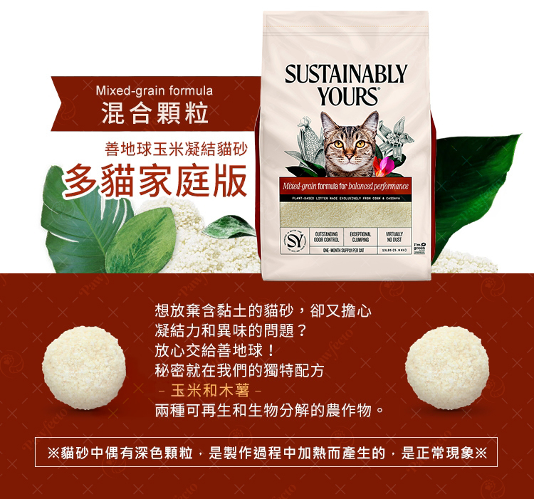 透過 Sustainably Yours 混合粒配方貓砂,體驗全新的潔淨與呵護!精心以天然粟米及木薯製成,帶來卓越效能。