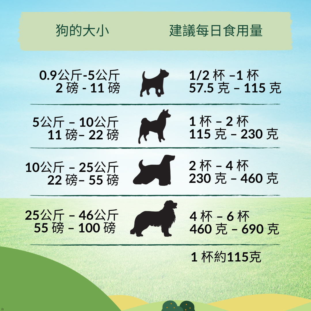 根據您的狗的個人需求調整餵食程度。幼犬和哺乳犬每天的攝取量可能會超過建議量。