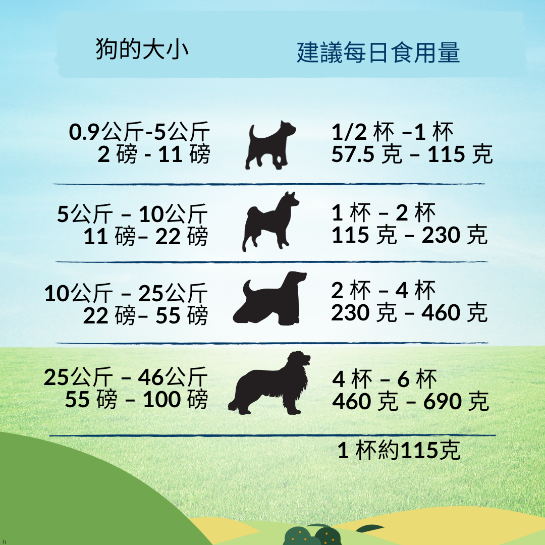 根據您的狗的個人需求調整餵食程度。幼犬和哺乳犬每天的攝取量可能會超過建議量。