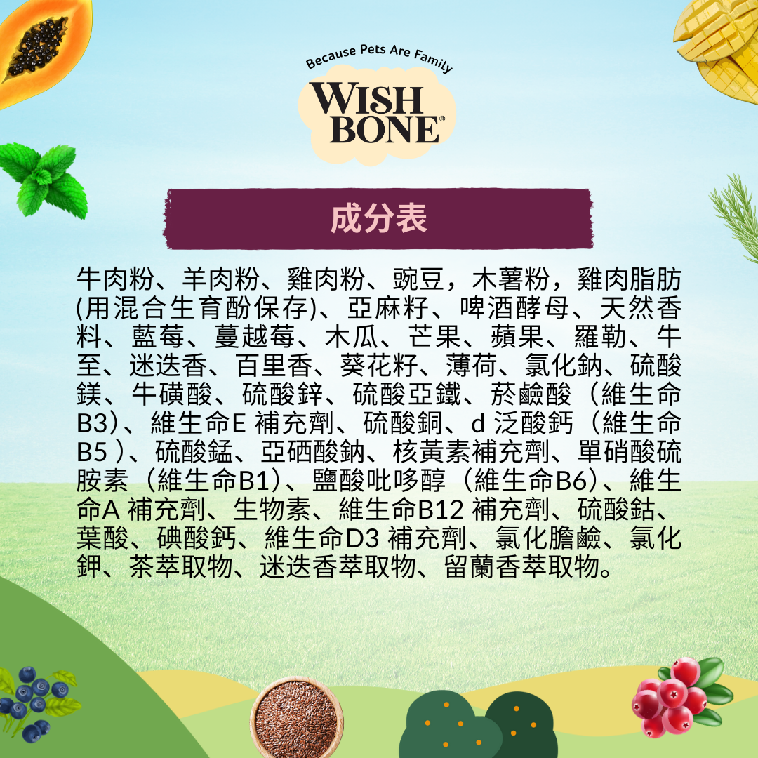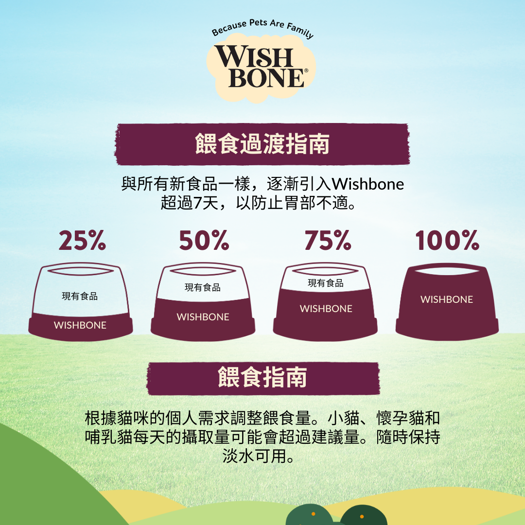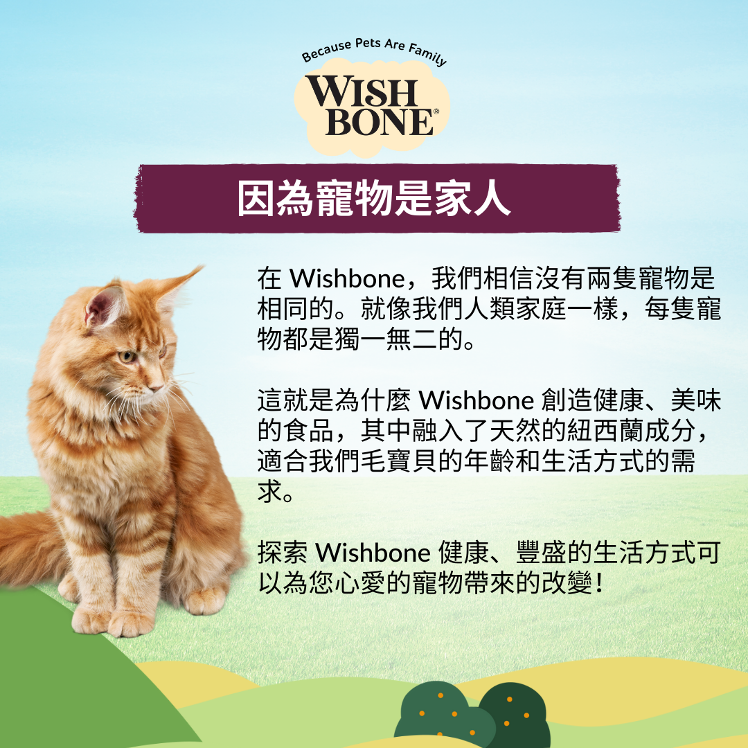 在 Wishbone,我們認識到寵物不僅僅是伴侶,它們還是家庭中珍貴的成員。他們有獨特的身份、情感和需求,值得我們給予最大的關懷和尊重。這就是為什麼我們致力於提供不僅滿足他們的營養需求,而且有助於他們整體健康的食物。我們的家族經營公司總部位於紐西蘭,致力於只採購最優質的原料。我們使用來自當地家庭農場的優質放養肉類和有機農產品。我們的每批食品都是小批量準備的,以確保始終新鮮,我們很自豪能夠提供 100% 無穀物和無麩質的產品。